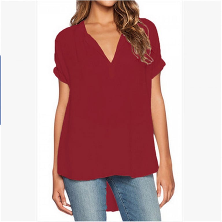 Blusa de chiffon para mujer con mangas cortas y escote en V con cuello. Corte asimétrico suelto. Material ligero y agradable. Tallas grandes disponibles. Disponible en varias opciones de color.