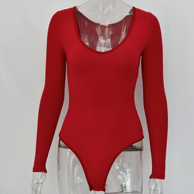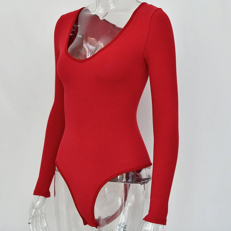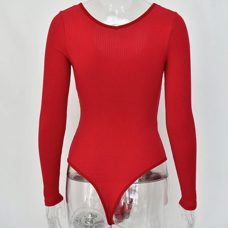 Body de camiseta de mujer con diseño de canalé y cierre de botones a presión. El body es elástico, tiene mangas largas y un escote profundo con hombros al descubierto. Disponible en varios colores.