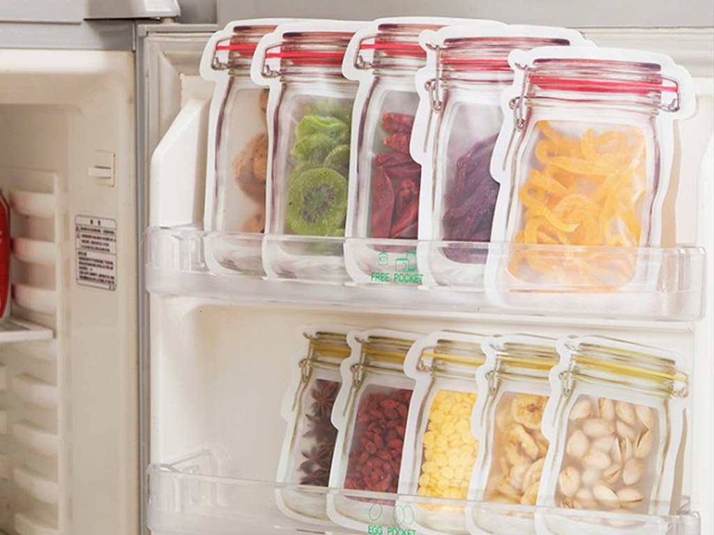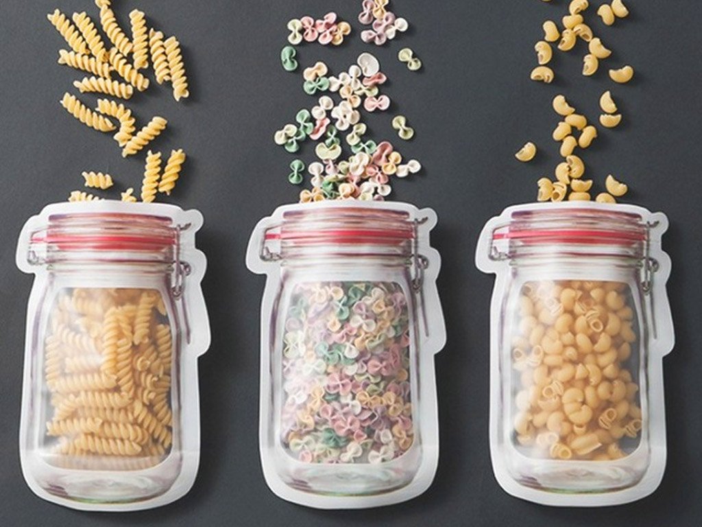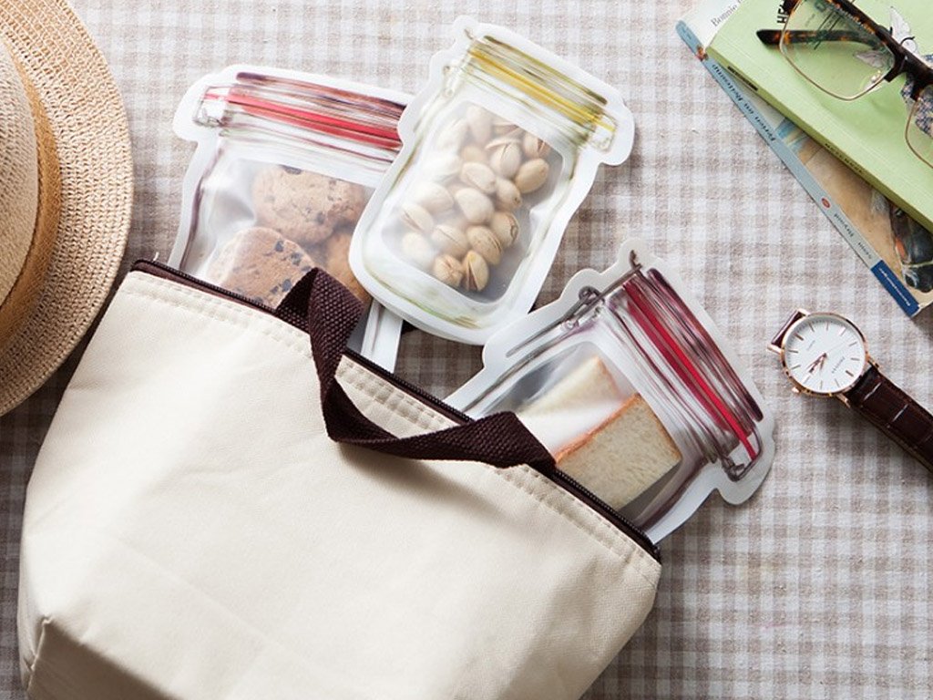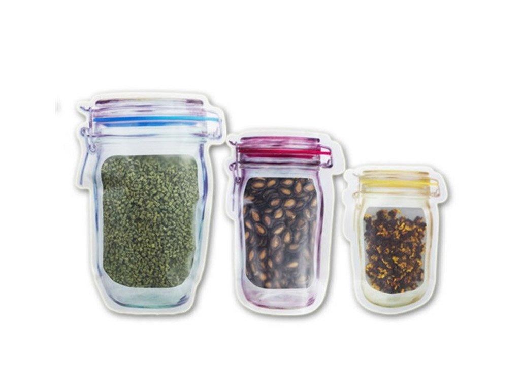 Bolsas transparentes con impresión de tarros y cierre de cremallera. El área transparente dentro de la impresión crea la ilusión de un tarro lleno. Desde lejos, pocos pueden notar que se trata de bolsas de alimentos selladas. Adecuadas para almacenar frutas secas, chips, especias, café, nueces y otros alimentos.