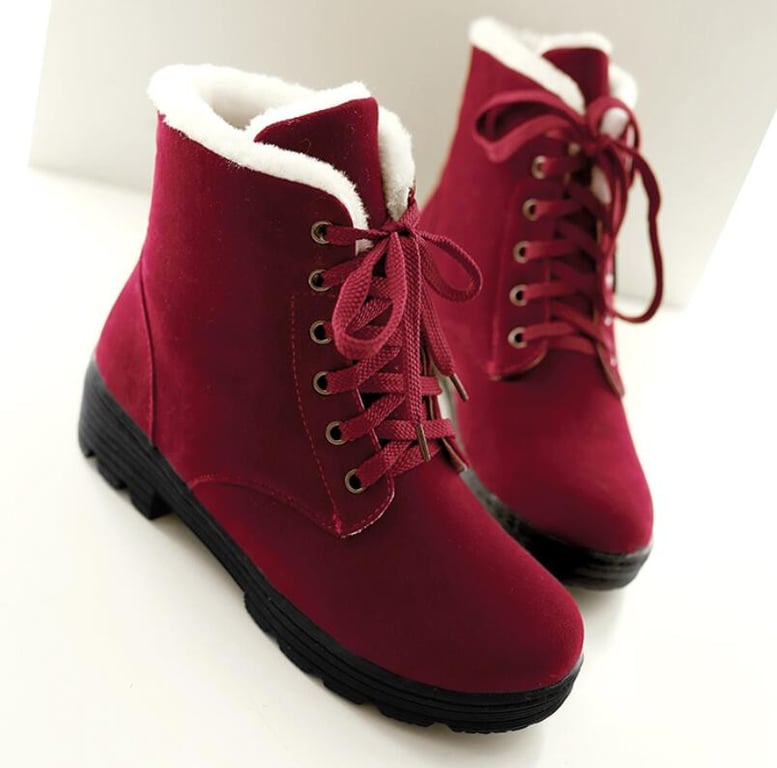 Botas de tobillo para mujer para el invierno con cordones. Las botas tienen una suela de goma con un patrón estriado y están forradas con pelaje en el interior. Disponibles en tres variantes de color: negro, marrón y rojo.