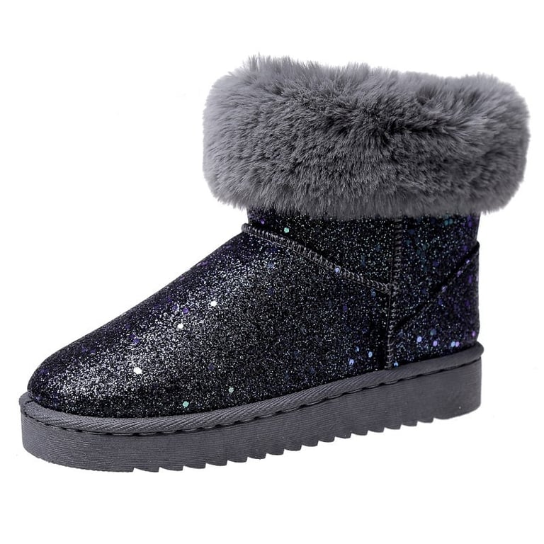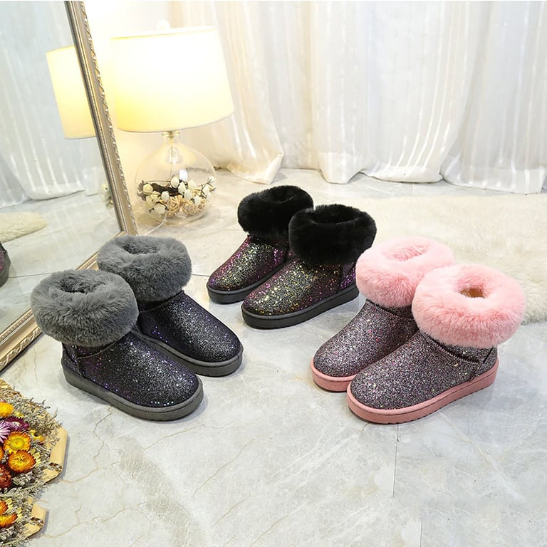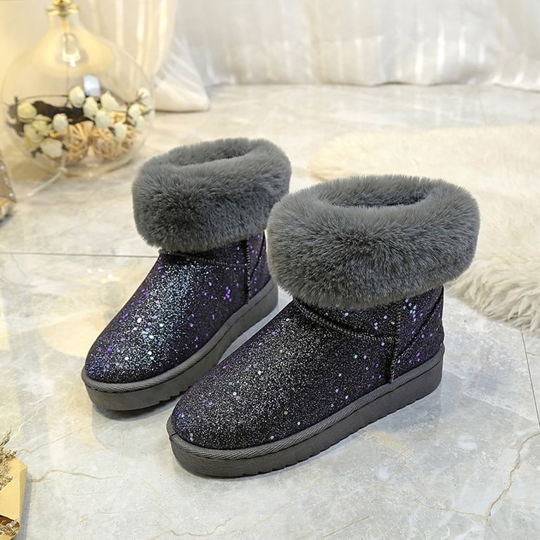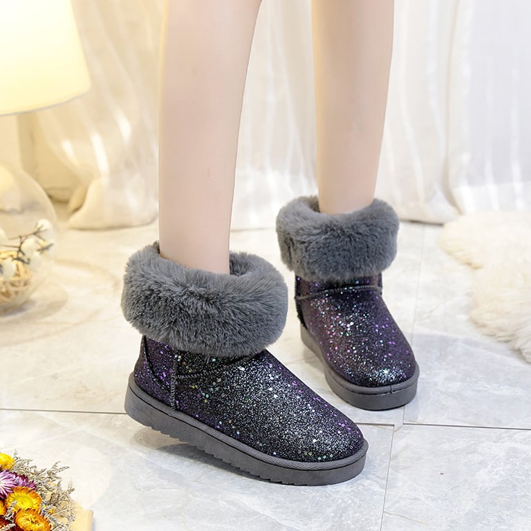 Botas de invierno para mujer con un gran forro de piel cálido en el interior. Las botas tienen suela de goma con un patrón estriado y la superficie está cubierta de purpurina. Disponibles en tres variantes de color.
