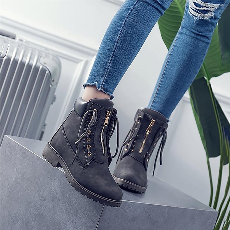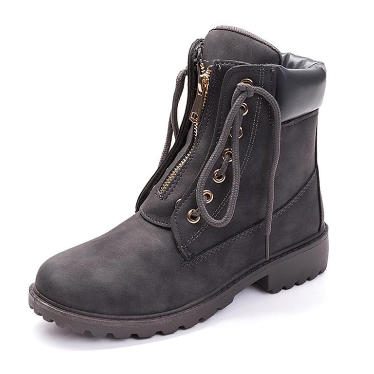 Botas de invierno para mujer con cordones y cremallera decorativa. Las botas tienen un aspecto de cuero y una suela de goma con un patrón estriado. Disponibles en varias opciones de color.