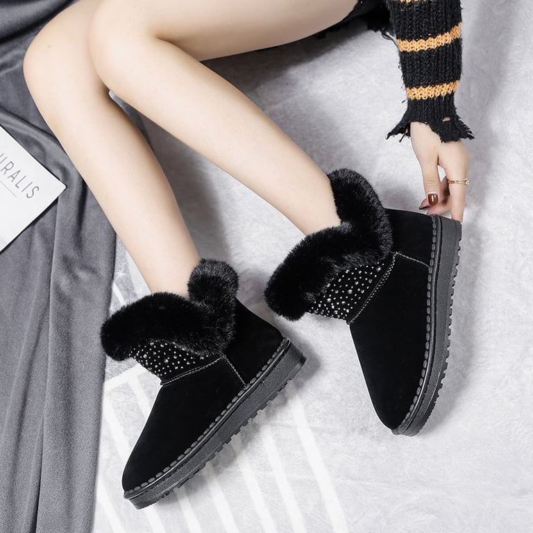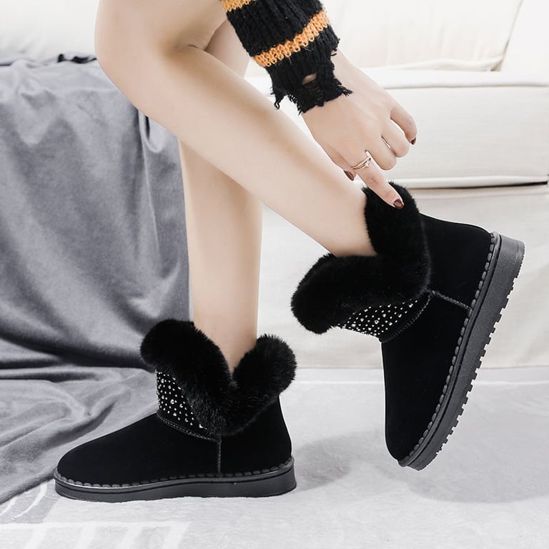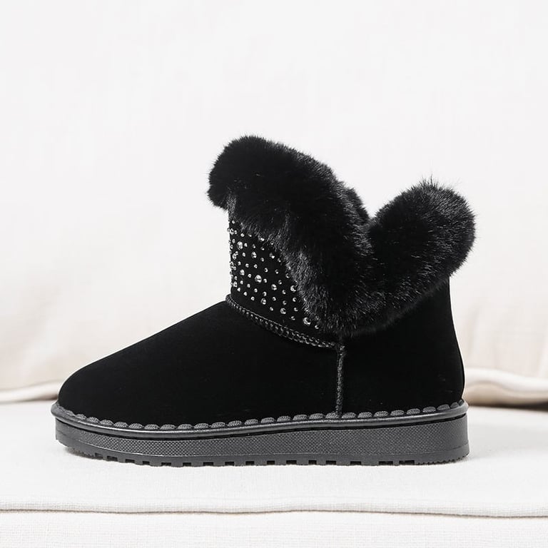 Botas de invierno para mujer. Las botas están forradas con un gran pelaje cálido y tienen una suela de goma con un patrón estriado. La parte delantera está decorada con pequeñas piedras. Disponibles en tres colores: negro, gris, caqui.