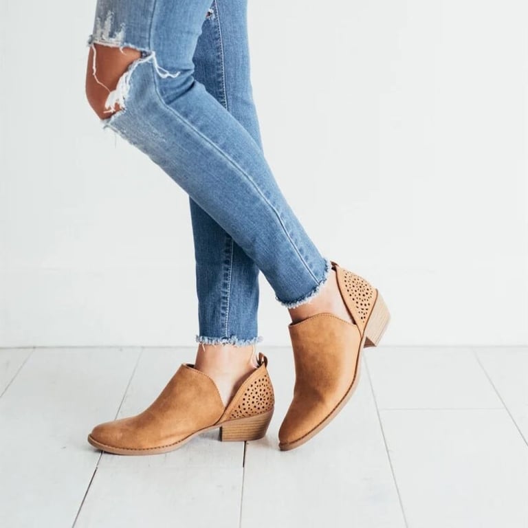 Zapatos de mujer tipo botín con punta redonda. Cuero sintético con perforaciones. Tacón bajo y ancho. Disponibles en varias opciones de color.