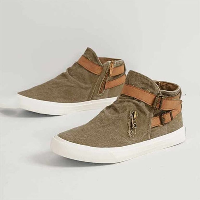 Botas de tobillo para mujer con aspecto de denim. Suela plana de goma. Hebillas decorativas de imitación de cuero. Cierre con cremallera en el lado interior. Disponibles en varias opciones de color.