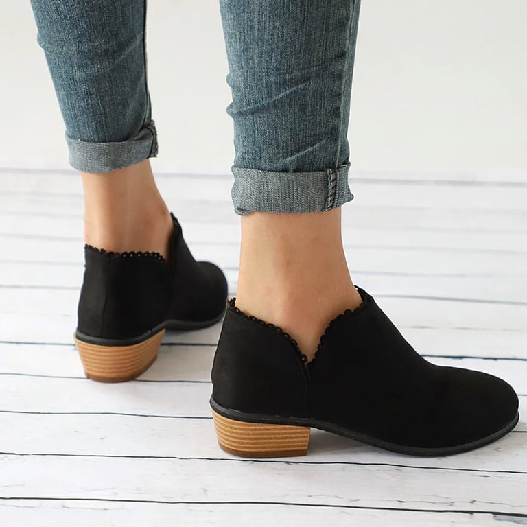 Botas de mujer de tobillo con tacón bajo. Las botas tienen un aspecto de cuero con un adorno discreto en los tobillos. Disponibles en varias opciones de color.