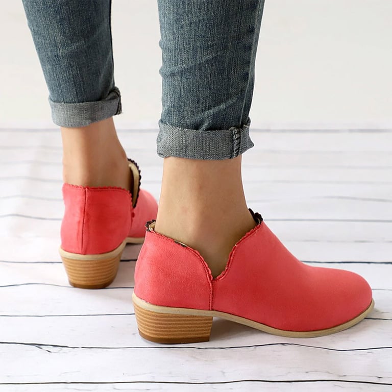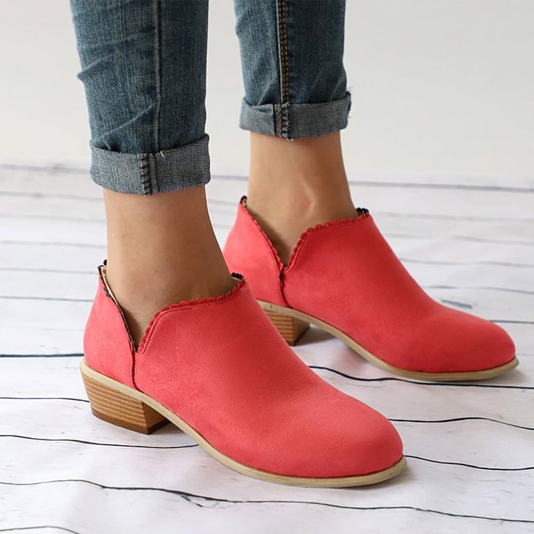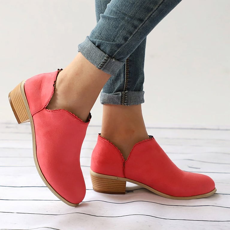 Botas de tobillo para mujer con tacón bajo. Las botas tienen un aspecto de cuero con un adorno discreto en los tobillos. Disponibles en varias opciones de color.
