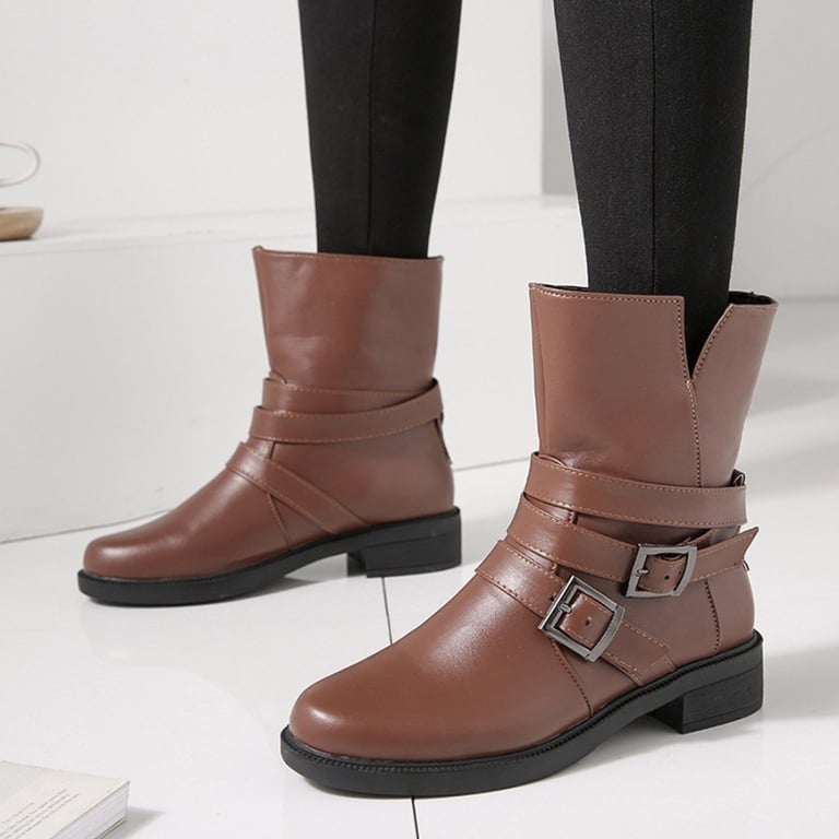 Botas de invierno para mujer de aspecto de cuero. Sin cordones. Decoradas con hebillas en el lado exterior. Disponibles en dos colores.