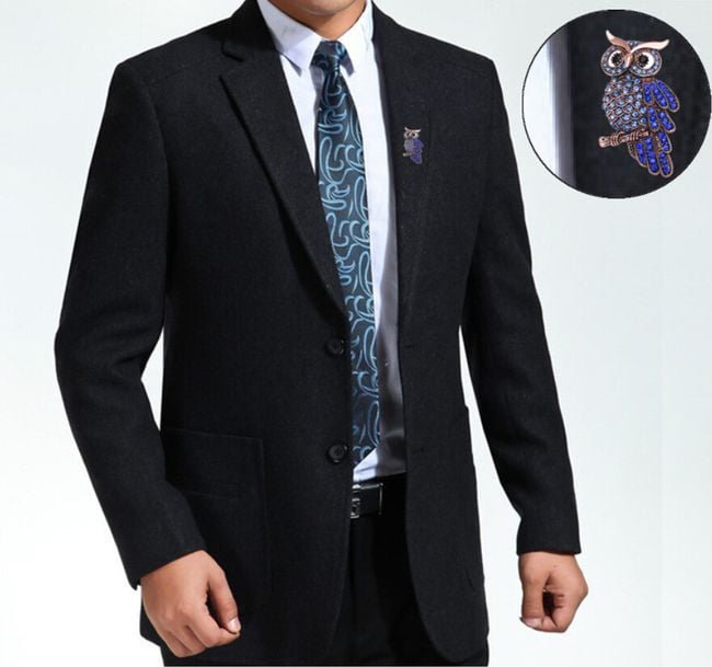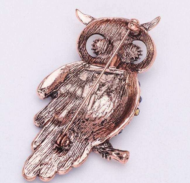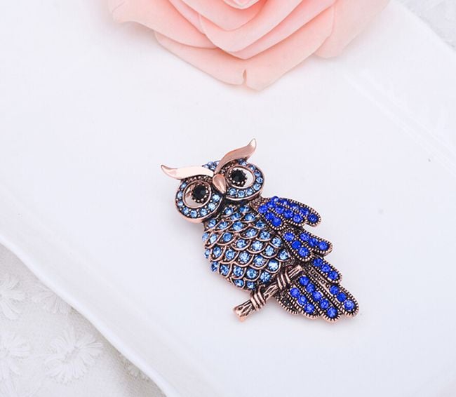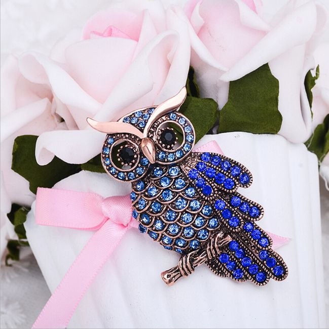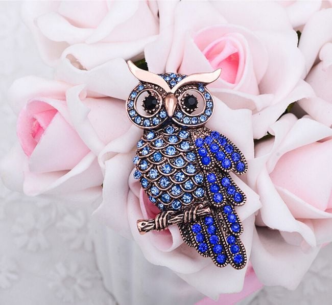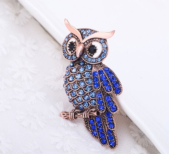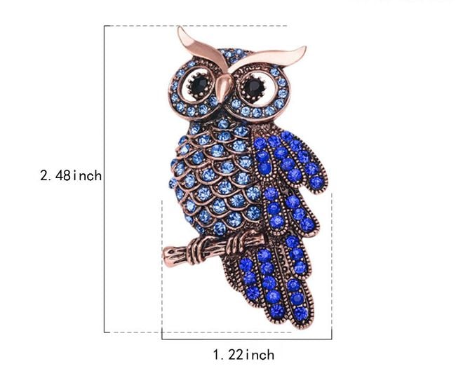 Broche decorativo en forma de un adorable búho adornado con pequeñas piedras de color azul. Dale un toque especial a tu atuendo con este búho, que es símbolo de sabiduría. Fácil de sujetar a la ropa con un imperdible. Adecuado tanto para chicas como para chicos en una chaqueta.