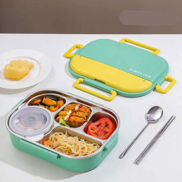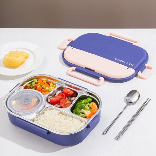 Caja de almuerzo de acero inoxidable con cinco compartimentos separados.