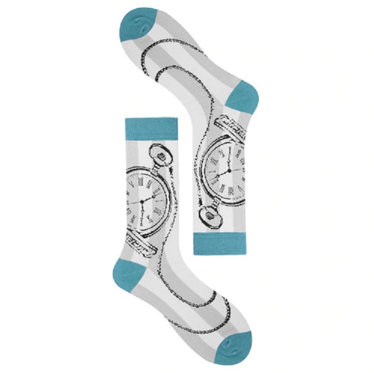 Los calcetines tienen un estampado de relojes de bolsillo.
