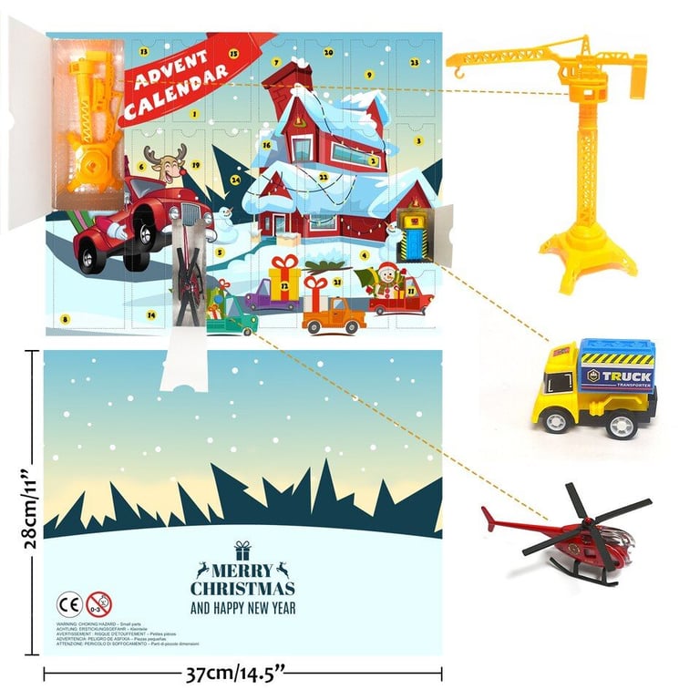 Calendario de adviento navideño con diferentes coches sobre una alfombra con carretera