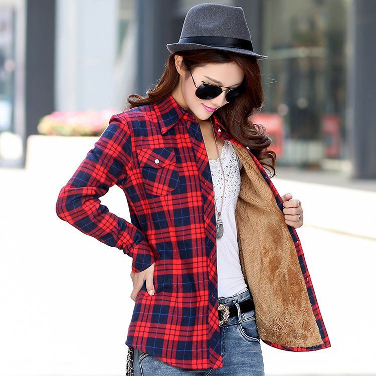 Camisa de mujer con patrón de cuadros. La camisa tiene mangas largas, cuello y cierre de botones. Forro de piel cálido. Bolsillos en el pecho. Disponible en varias variantes.