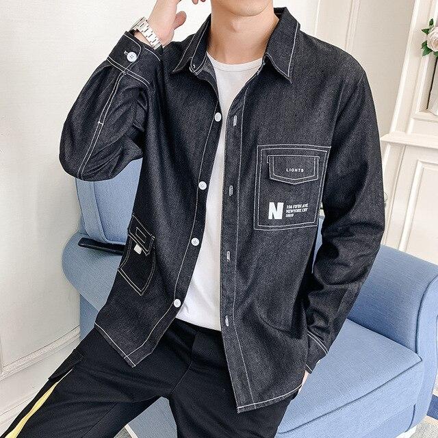 Camisa de mezclilla para hombre con costuras contrastantes. Dos bolsillos decorativos en la parte frontal.