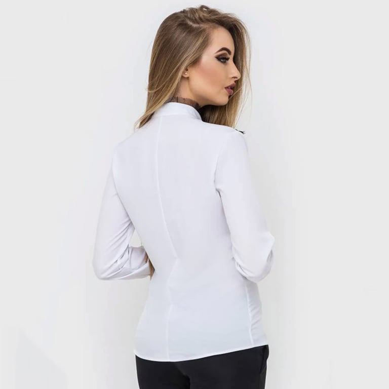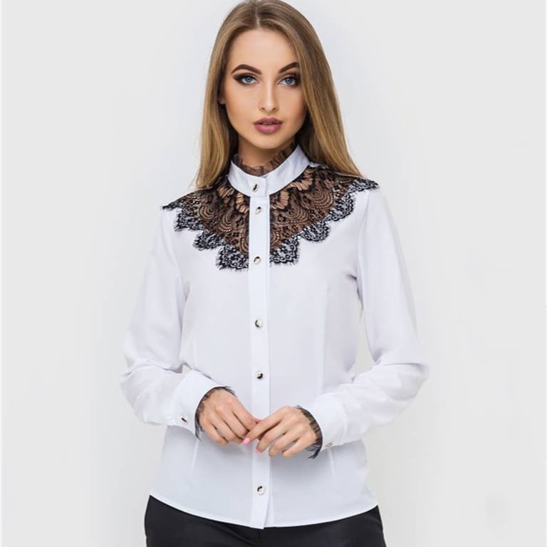 Camisa blanca elegante para mujer con cuello y cierre de botones. La camisa tiene mangas largas y un escote adornado con encaje negro.