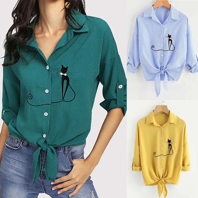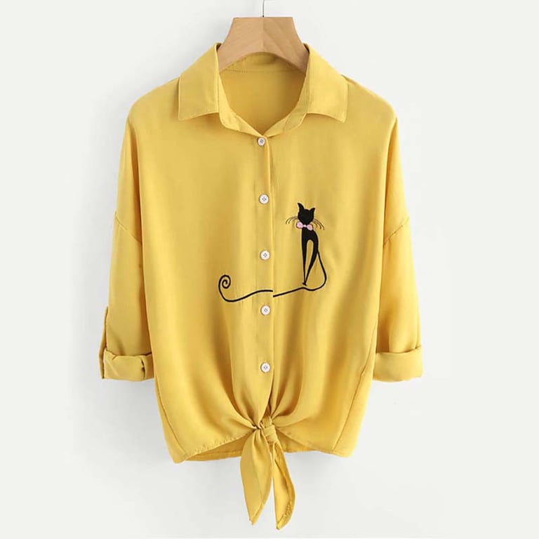 Una blusa de tendencia genial con un motivo de gatito y un lazo interesante.