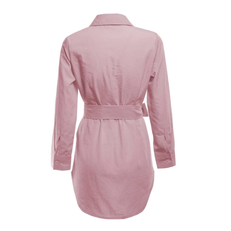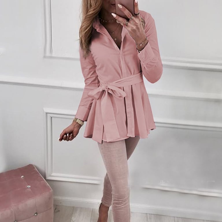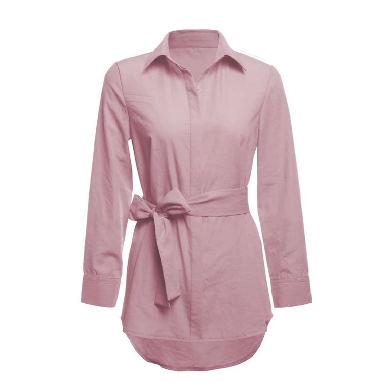 Camisa de mujer de manga larga con escote en V y cuello. La camisa tiene cierre de botones y un cinturón para atar en la cintura. Disponible en varios colores.