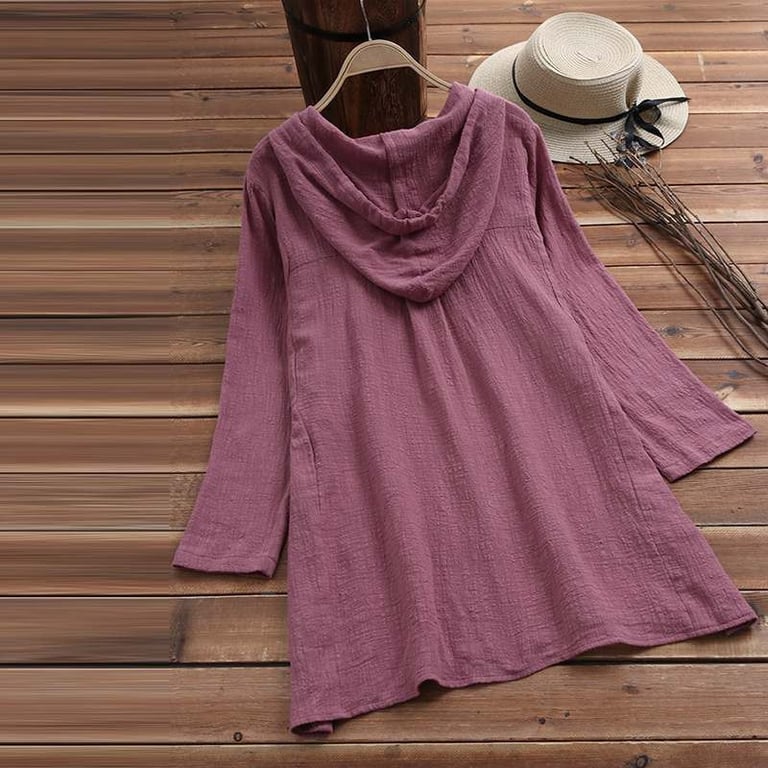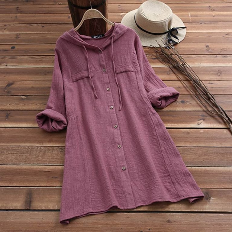 Blusa de camisa para mujer con escote y capucha. Corte largo y suelto con cierre de botones. Manga larga. Disponible en varias opciones de color.