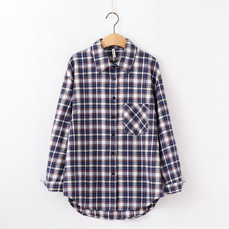 Camisa de mujer oversize con un patrón de cuadros de colores. La camisa tiene un corte holgado con un bolsillo en el pecho, cierre de botones y cuello con solapa. Varias opciones de color disponibles.