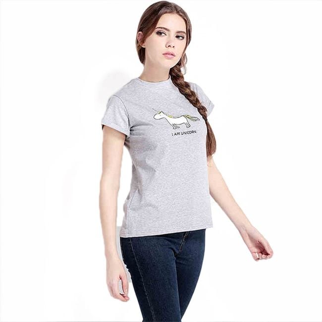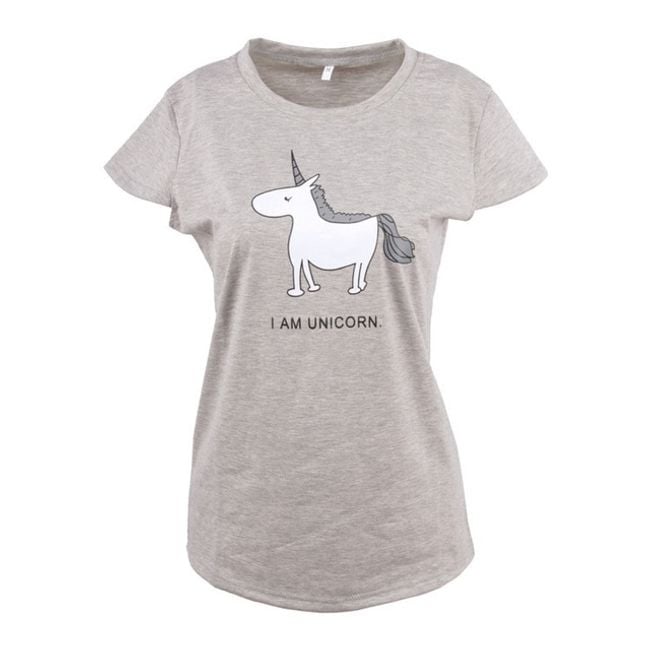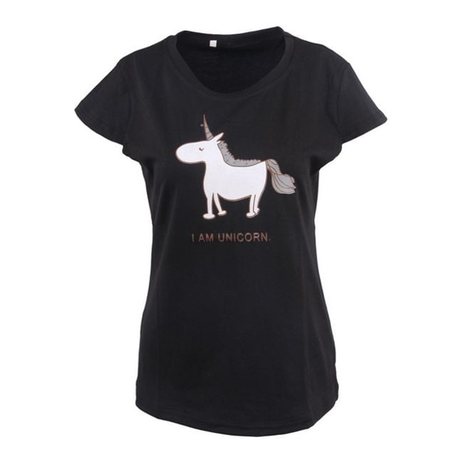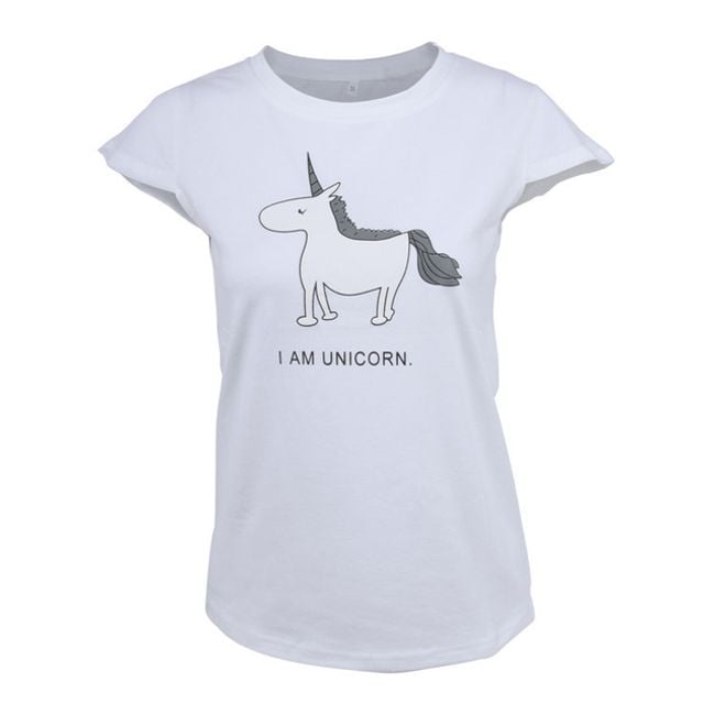 La camiseta es de un solo color y tiene un diseño estiloso con un unicornio y la frase "I am unicorn" = soy un unicornio. Por lo tanto, la camiseta es adecuada para todas las amantes de estas criaturas míticas.