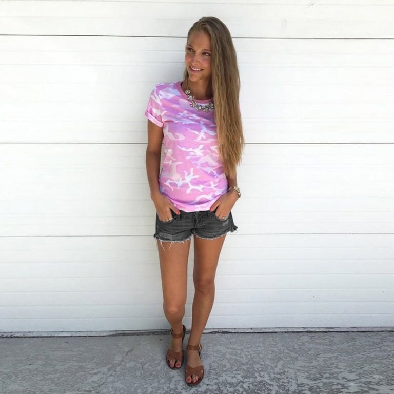 Camisa de mujer de manga corta y escote redondo. Corte recto. Impresión a color con patrón militar. Disponible en dos variantes.
