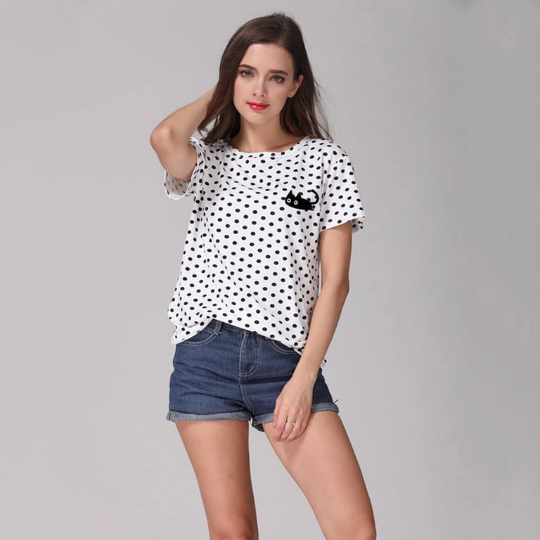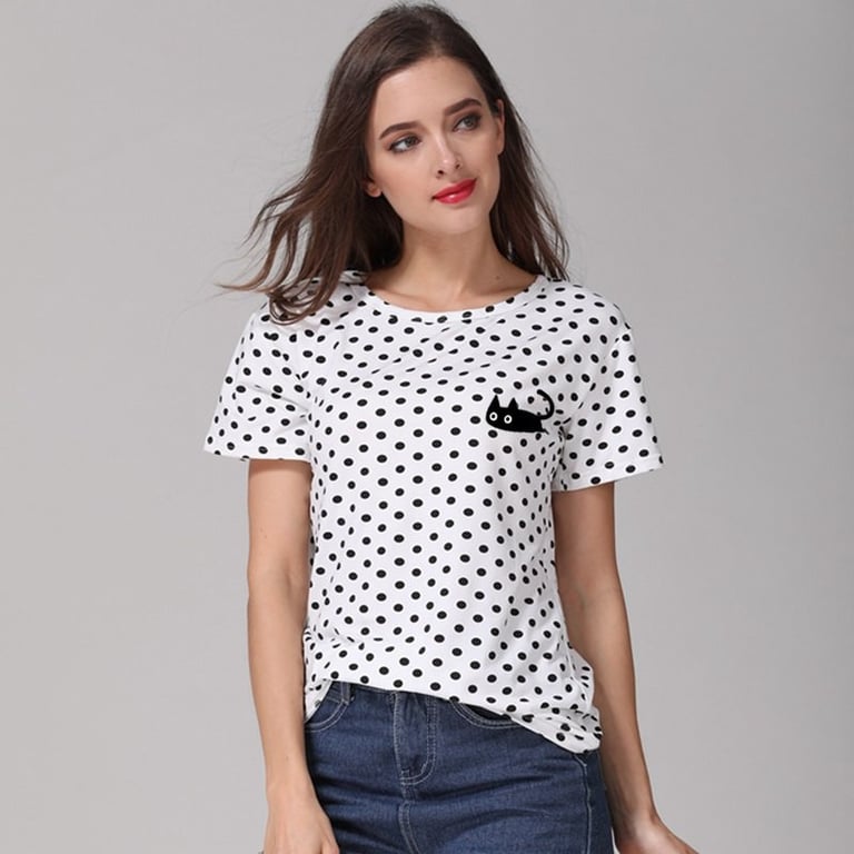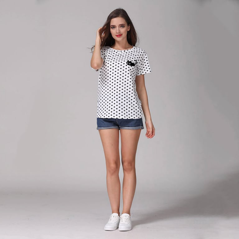 Camiseta blanca de mujer con puntos negros y estampado de un gato negro. Material agradable, corte suelto y cómodo. La camiseta tiene mangas cortas y escote redondo.