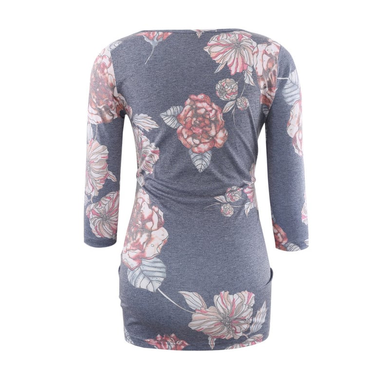 Camisa de maternidad para mujer con escote redondo. La camiseta tiene mangas 3/4, un corte cómodo y es holgada en la barriga. Disponible en cuatro variantes.