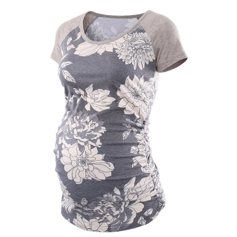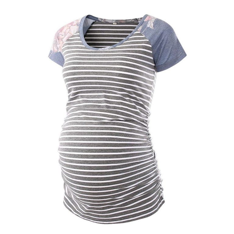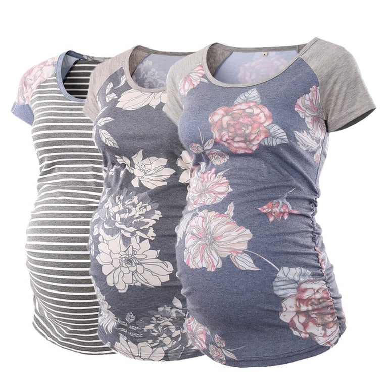 Camisa de maternidad de mujer con manga corta. Escote redondo, suelta sobre el vientre, material agradable. Conjunto de tres camisetas: azul, gris y a rayas.