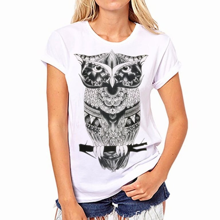 Camisa de mujer de manga corta. Corte recto y suelto con escote redondo. Estampado con motivo de búho en la parte delantera. Disponible en varias opciones de color.