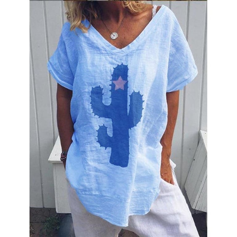Camisa de mujer con estampado colorido de cactus en la parte delantera. Corte holgado con mangas cortas y escote en V. Disponible en varias opciones de color.