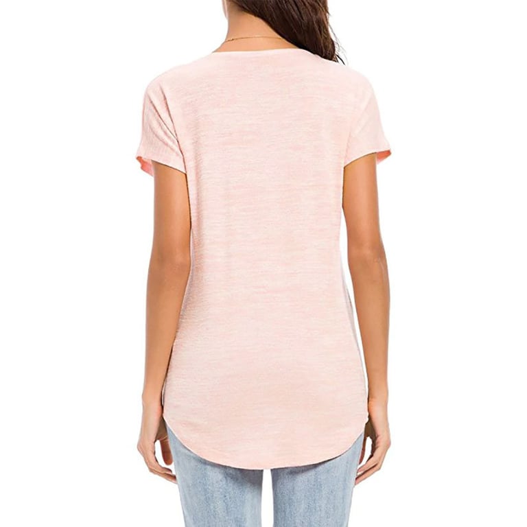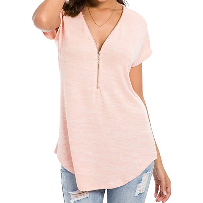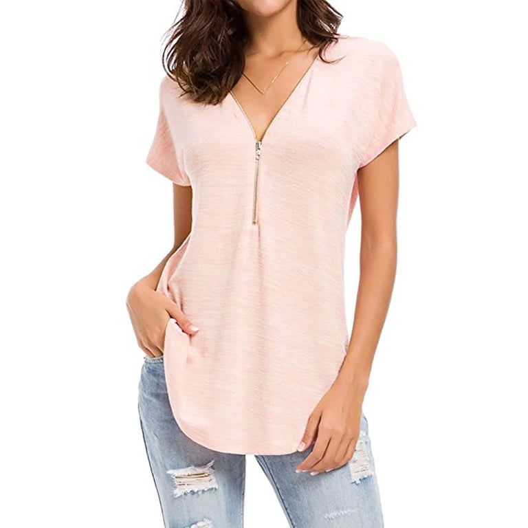 Camisa de mujer de corte holgado con mezcla de colores. La camiseta tiene mangas cortas y un escote en forma de V con un cierre decorativo de cremallera. Material agradable y transpirable. Disponible en varias opciones de color.