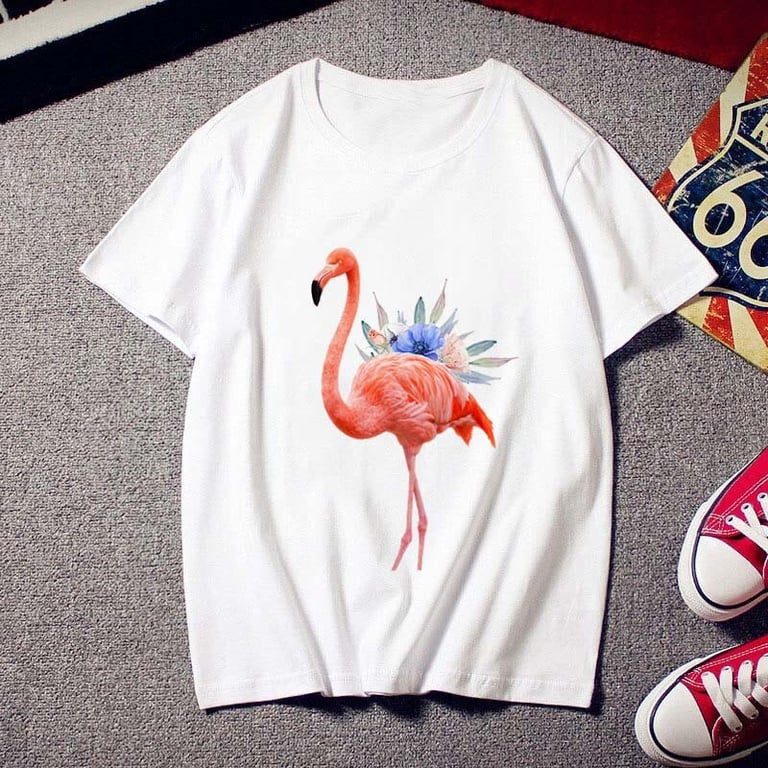 Camisa de mujer de manga corta. Impresión colorida con un pelícano en la parte delantera. Corte holgado con escote redondo.