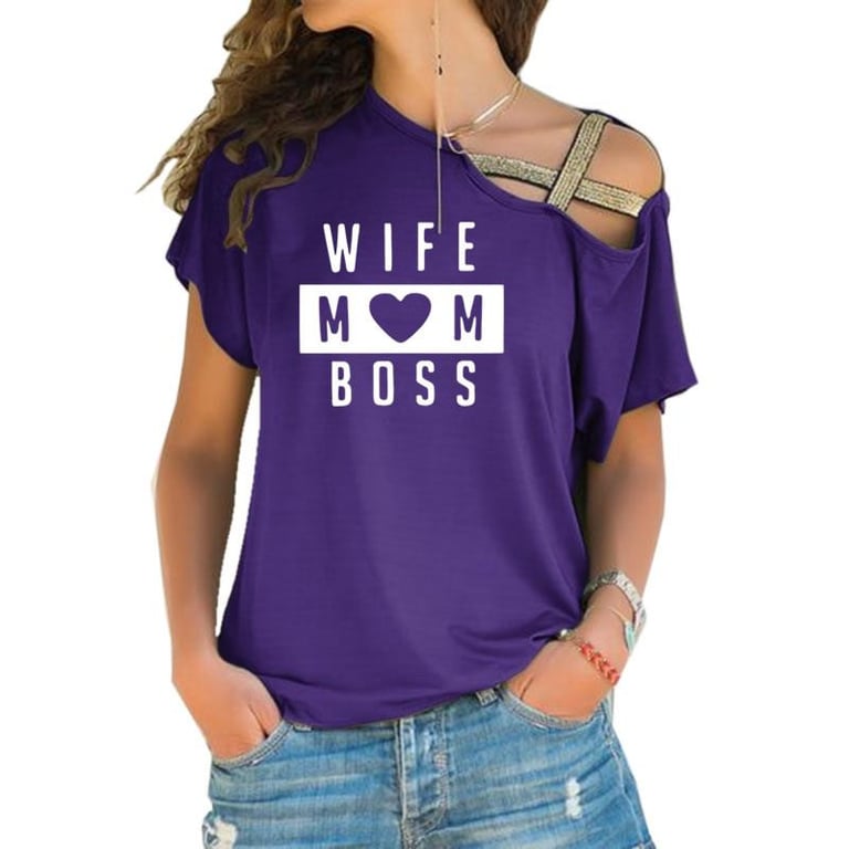 Camiseta de mujer con estampado en la parte delantera. Corte holgado con mangas cortas y escote con hombros caídos. Varias opciones de color.