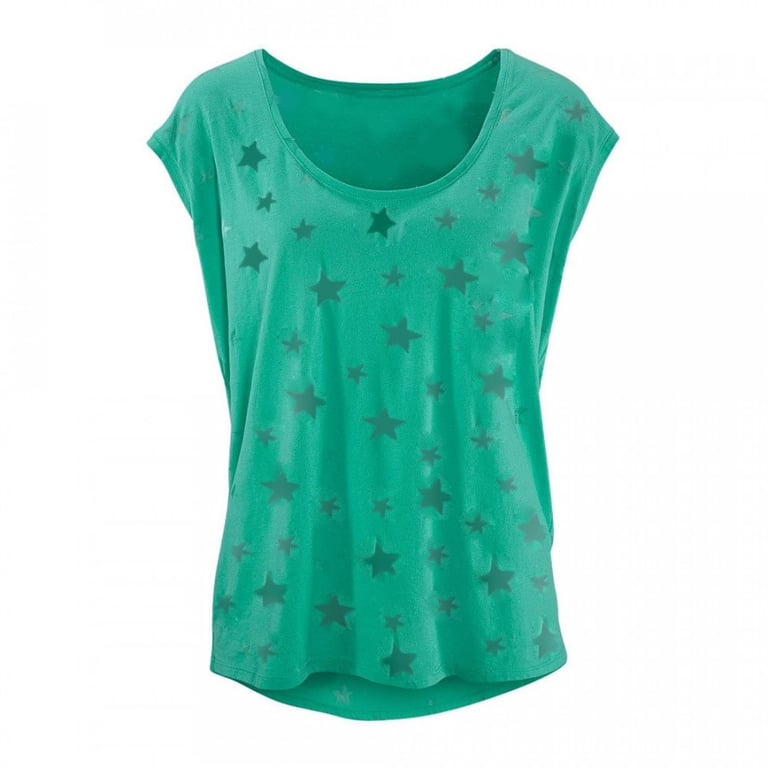 Camisa de mujer de manga corta y escote redondo. La camiseta tiene un corte suelto y cómodo y un estampado con estrellas discretas. Disponible en varios colores.