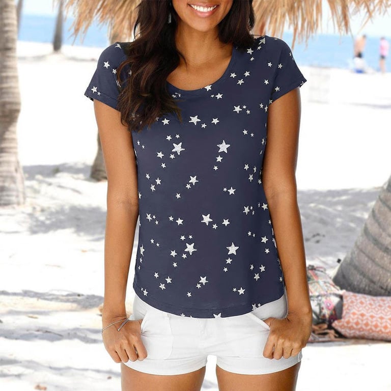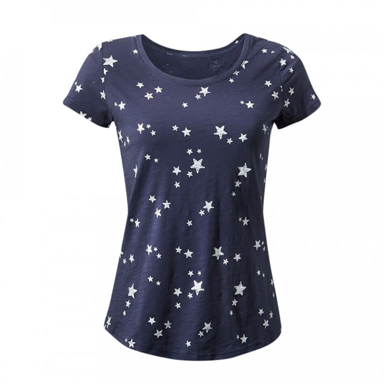 Camisa de mujer de manga corta y escote redondo. La camiseta tiene un estampado de estrellas. Corte holgado y cómodo. Disponible en varios colores.