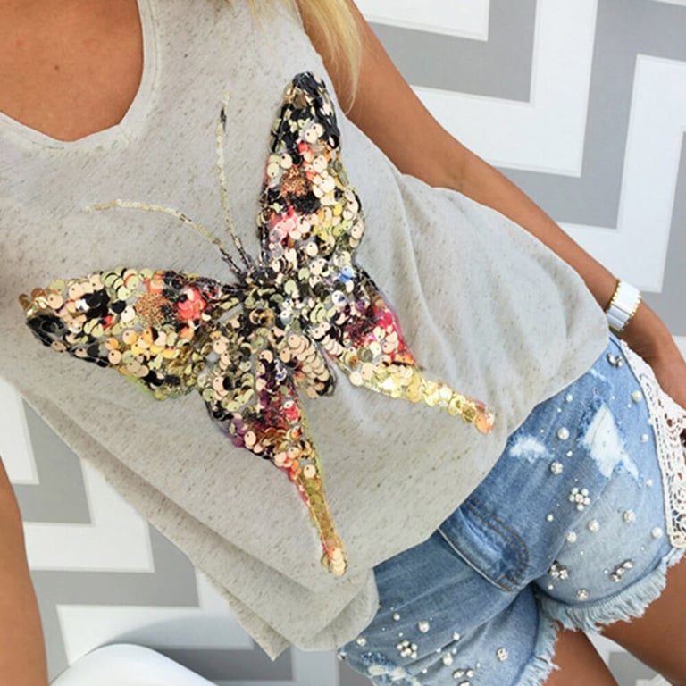 Camisa de mujer de manga corta. Motivo bordado de mariposa con lentejuelas en la parte delantera. Corte holgado con escote en V.