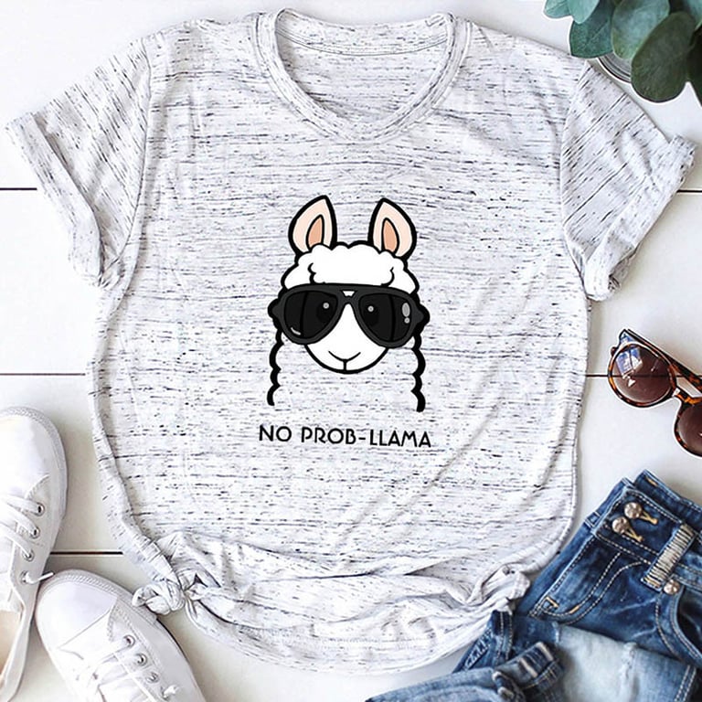 Camisa de mujer con un diseño original de una llama con gafas. La camiseta tiene un escote redondo, mangas cortas y un corte recto y holgado. Disponible en tallas grandes y en varias opciones de color.