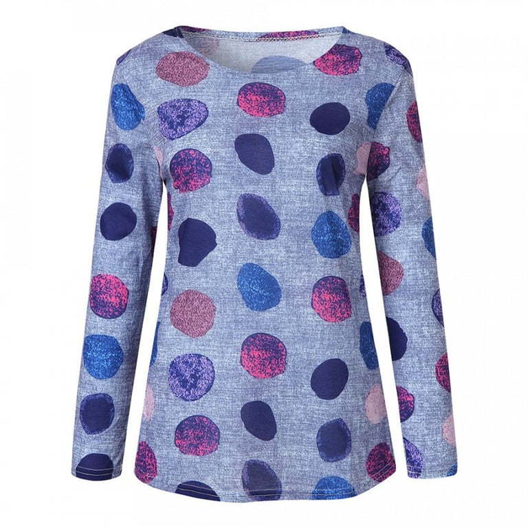Camisa de mujer de manga larga y escote redondo. Material cómodo y agradable. Corte recto. La camiseta tiene un estampado con un patrón de puntos. Tallas grandes. Disponible en varias variantes.