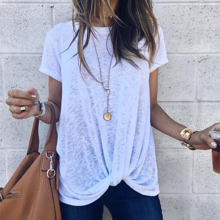 Camisa de mujer de manga corta y escote redondo. Corte holgado con detalle de nudo en la parte delantera. Disponible en varios colores.