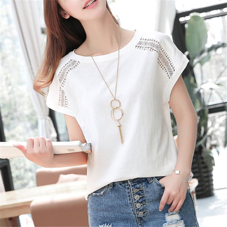 Camisa de mujer de manga corta con perforaciones decorativas. La camiseta tiene un corte holgado y un escote redondo. Disponible en varios colores.