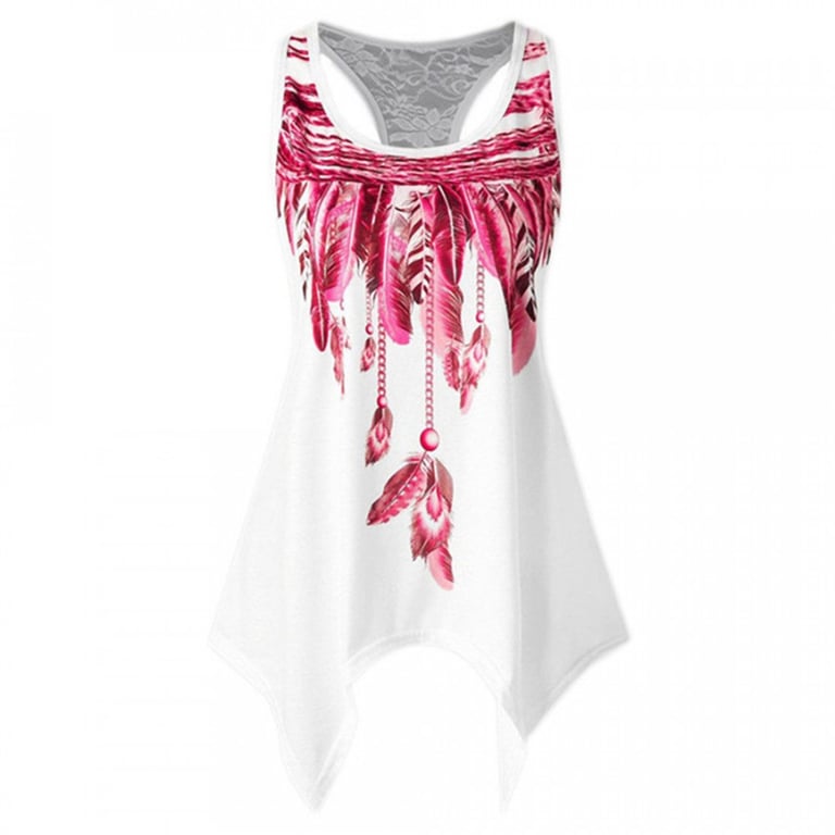 Camisa sin mangas para mujer con tirantes anchos. En la parte posterior, escote con encaje y en la parte delantera, estampado colorido con plumas. Corte asimétrico y suelto. Tallas grandes disponibles. Varias opciones para elegir.