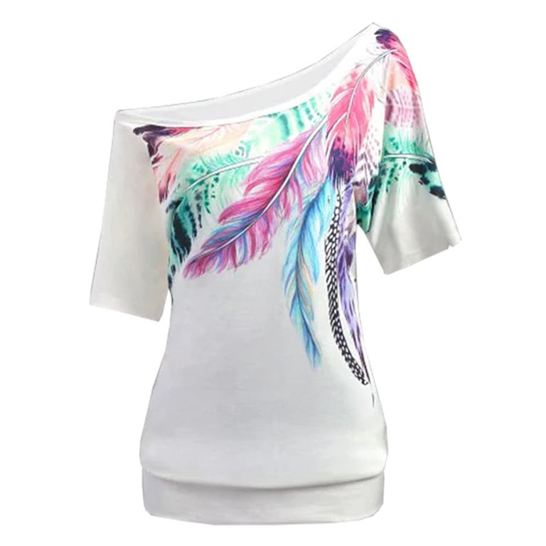 Camisa de mujer de manga corta. La camiseta tiene un escote con hombros caídos. Corte holgado y cintura elástica. Impresión a color con plumas. Tallas grandes. Disponible en varias variantes.