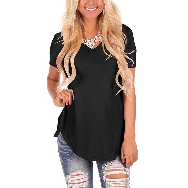 Camisa larga de mujer con mangas cortas y escote en V. La camiseta tiene un corte asimétrico suelto. Material ligero y agradable. Disponible en tallas grandes y en varias opciones de color.