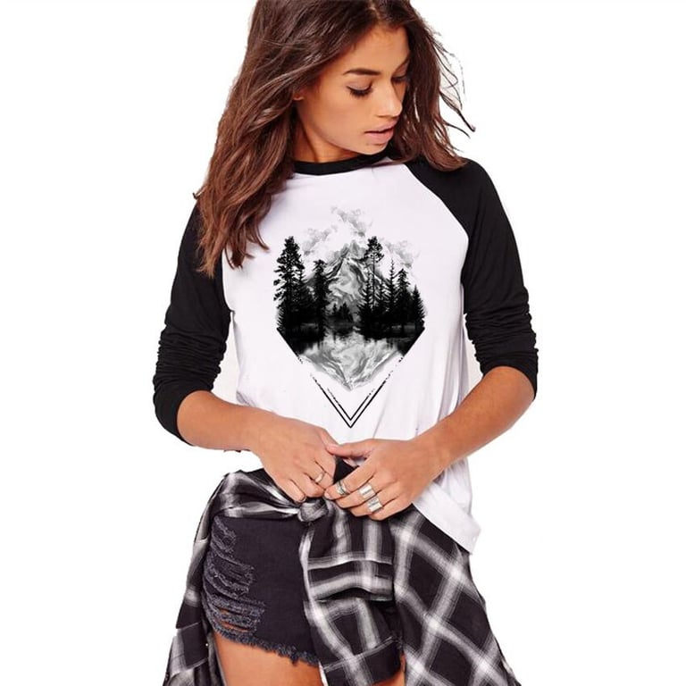 Camisa de mujer con mangas de 3/4 de color. La camiseta tiene un corte recto y suelto, escote redondo y estampado en la parte delantera.