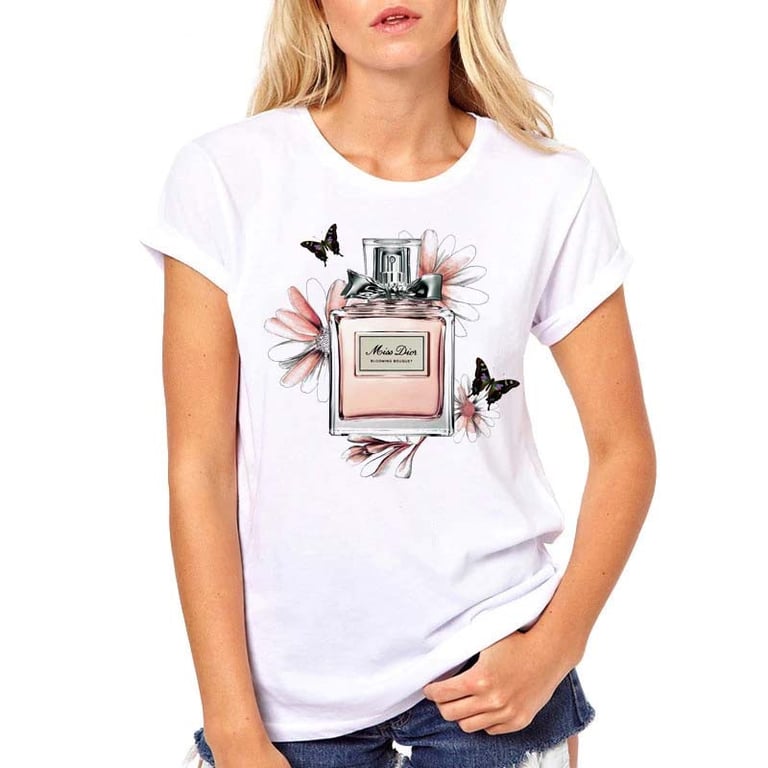 Estilosa camiseta de mujer con motivo de perfume. ¡Elige una pieza especial que definitivamente no debería faltar en tu armario!