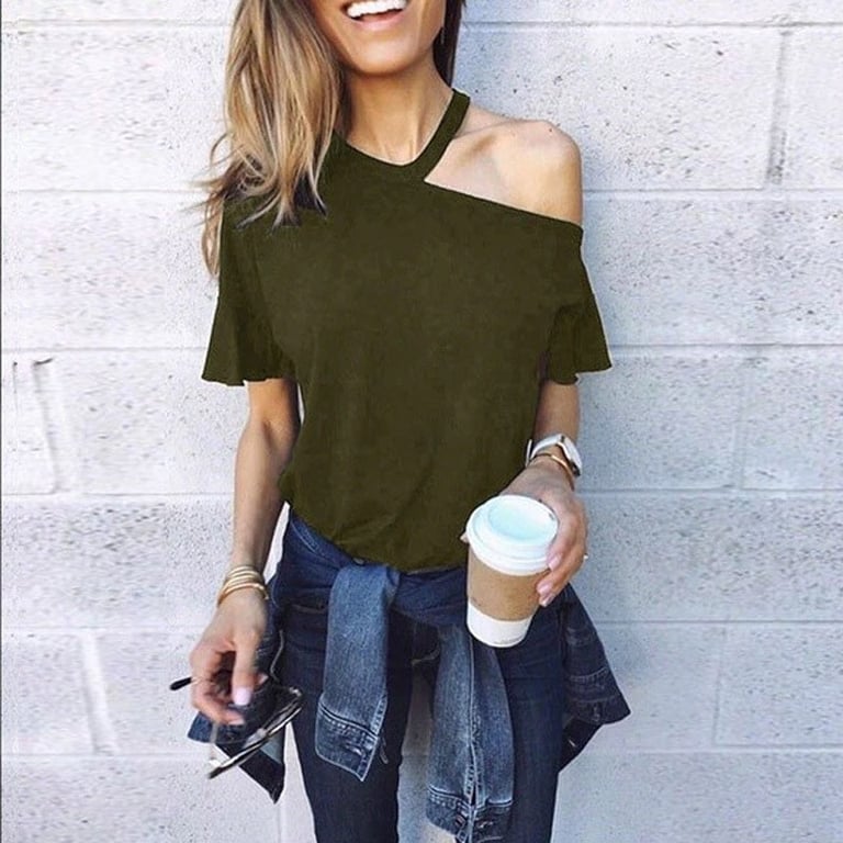 Camisa de mujer de manga corta con escote y hombro descubierto. Corte holgado. Disponible en varias opciones de color.