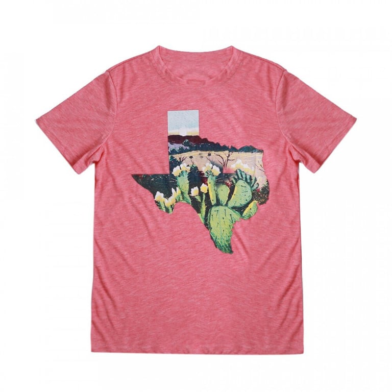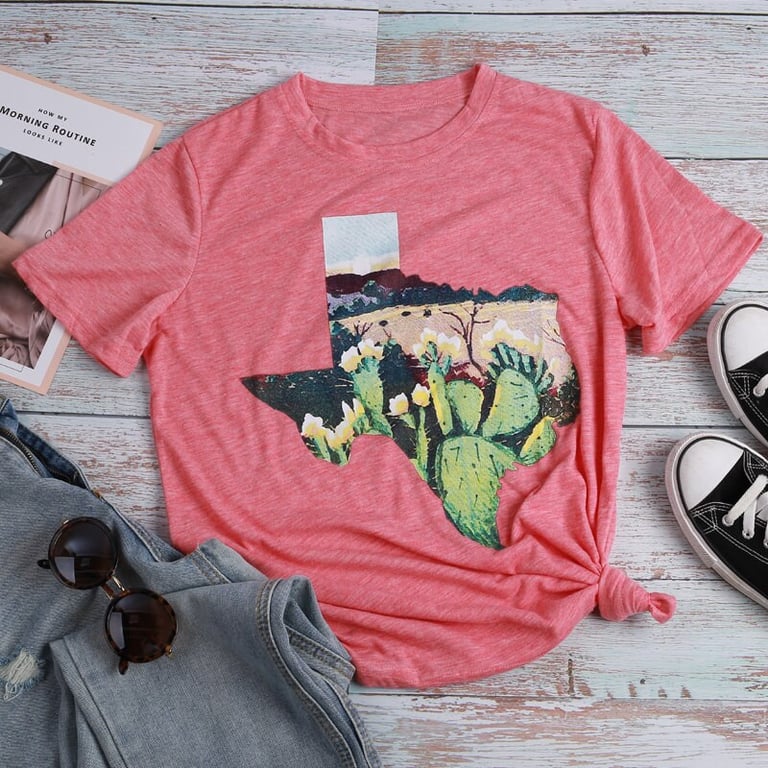 Camisa de mujer de manga corta y escote redondo. Impresión a color con motivo de cactus. Corte recto y suelto.