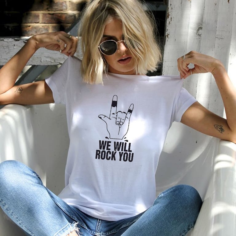 Camisa de mujer de manga corta y escote redondo. Impresión con texto en la parte delantera. Corte recto y suelto.