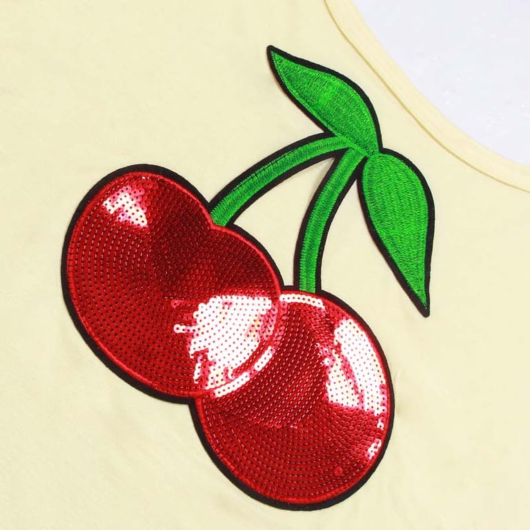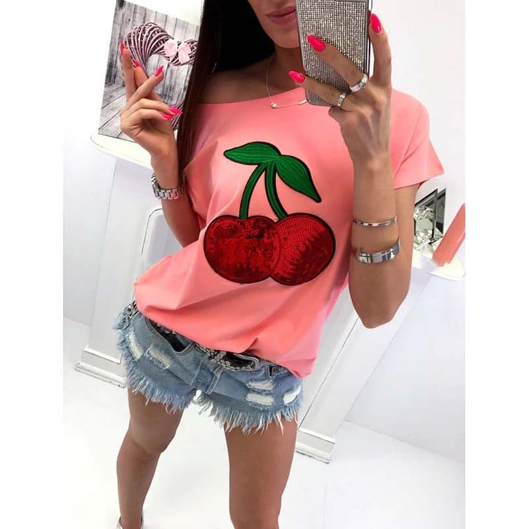 Estilosa camiseta de mujer con cerezas, que es una prenda perfecta para el armario de primavera y verano. ¡Dale vida a tu look con bonitos colores, el envío es gratis!