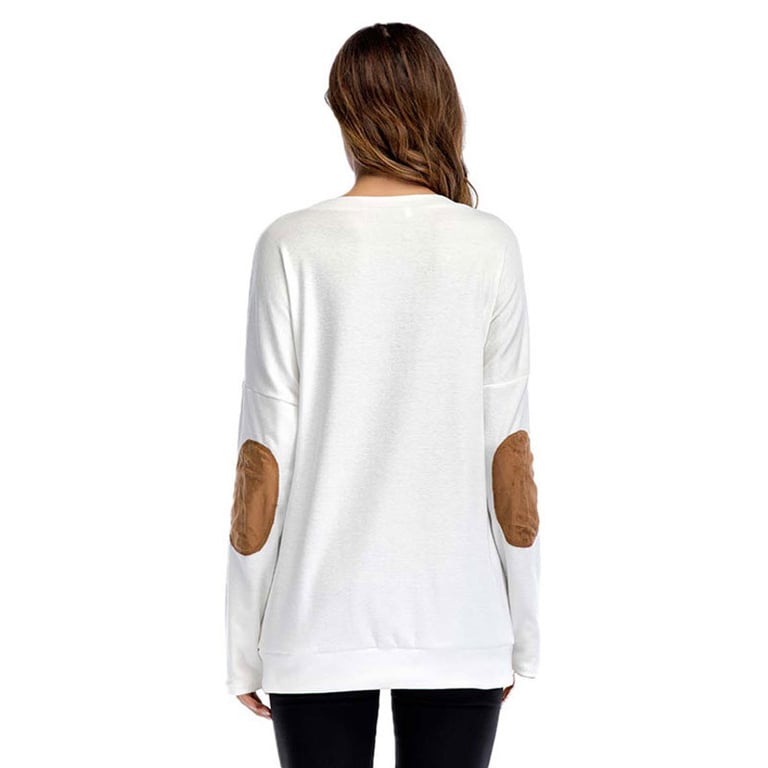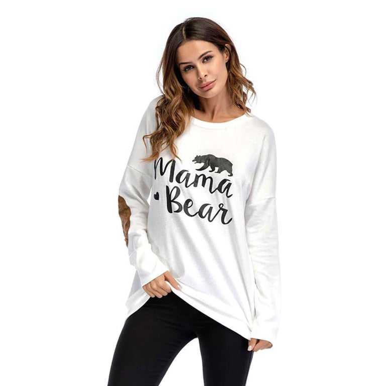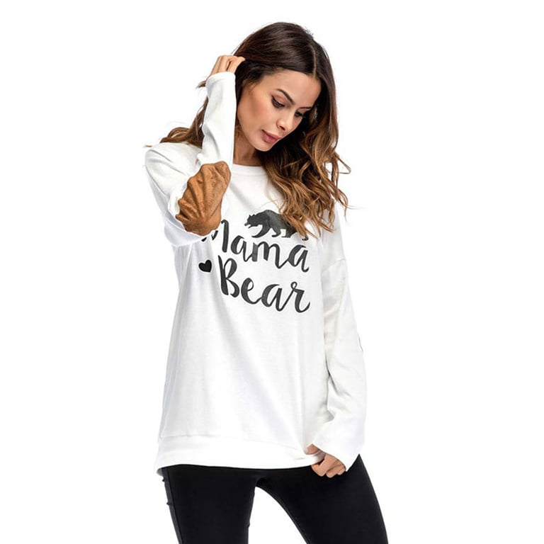 Camisa de mujer de manga larga “mamá oso”. La camiseta tiene un escote redondo y parches cosidos en los codos. Disponible en varias opciones de color.